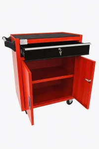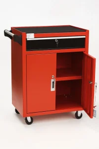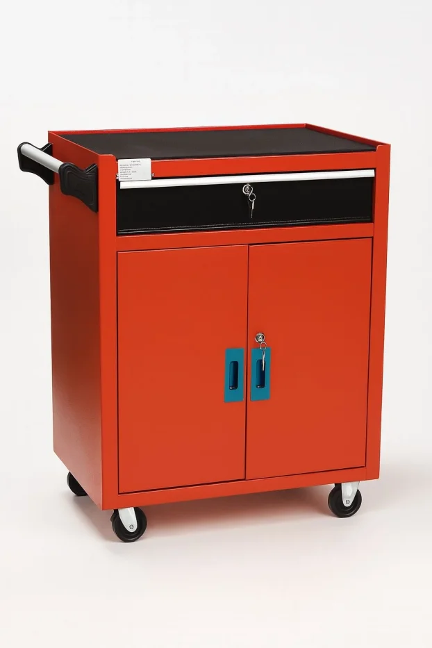 Praktična kolica s policama sa zaključavajućim ormarom od lima. Kolica imaju fioku, dve čvrste plastične police sa podignutim ivicama . Imaju četiri točka, od kojih se dva mogu zaključati. To su fleksibilna kolica za skladištenje u težim uslovima.