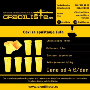 Izdajemo profesionalne cevi za šut, idealne za odlaganje građevinskog otpada sa višespratnih objekata. Cevi su otporne, jake i jednostavne za montažu, pogodne za gradilišta svih veličina.